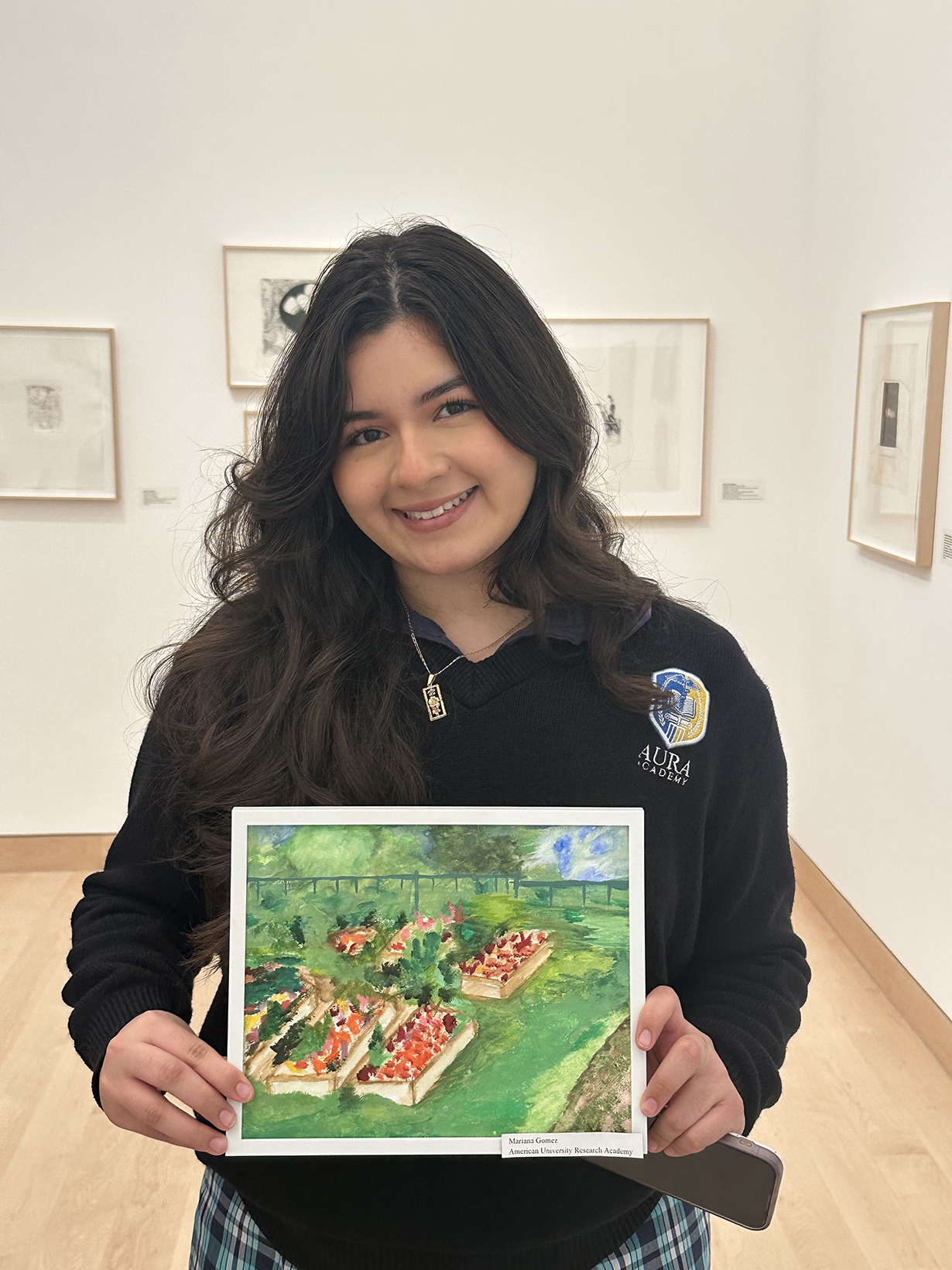 AURA students Mariana Gomez, Moses Infante, and Angelina Sanchez created original artwork prompted by the Museum’s challenge “What do you want the future of your community to look like?” Their original mixed media paintings will be on display in the community student gallery at the Kleefeld Contemporary Art Museum until November 22nd.